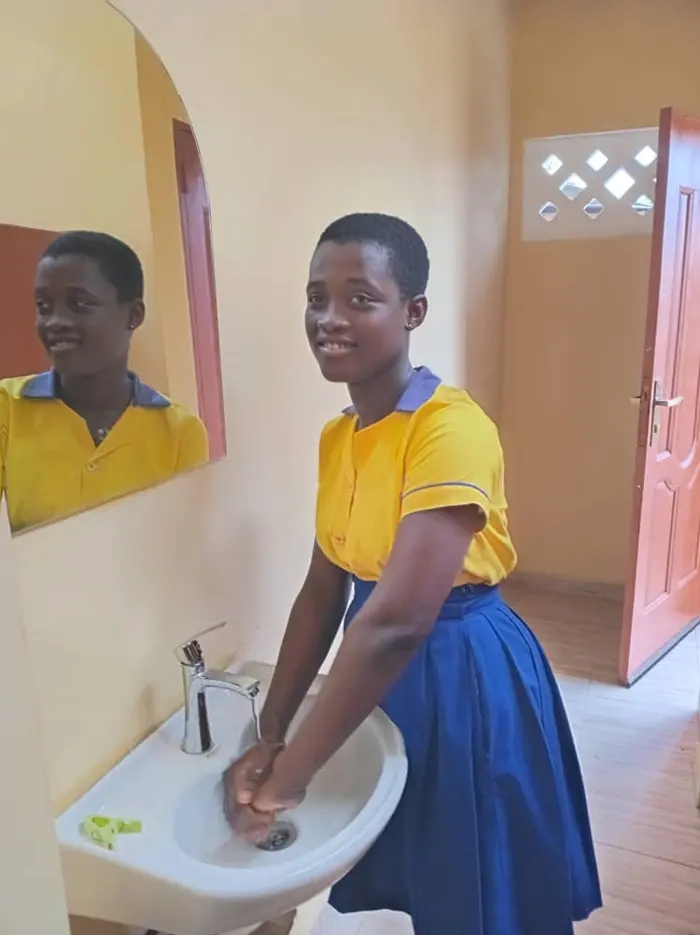 Elizabeth is a 16-year-old junior high school student who uses her school’s new WASH facility, funded by The One Foundation, to practice proper handwashing with soap.